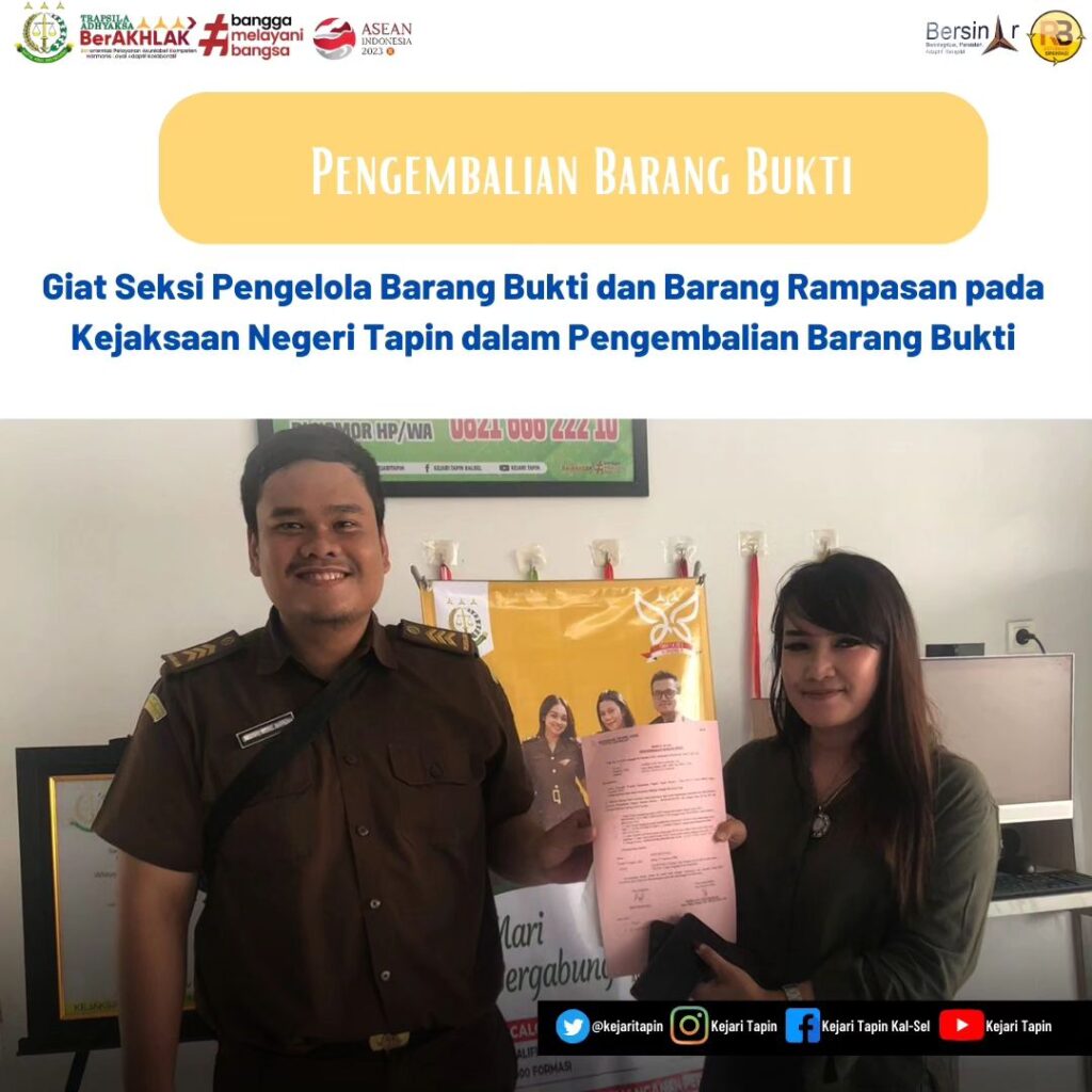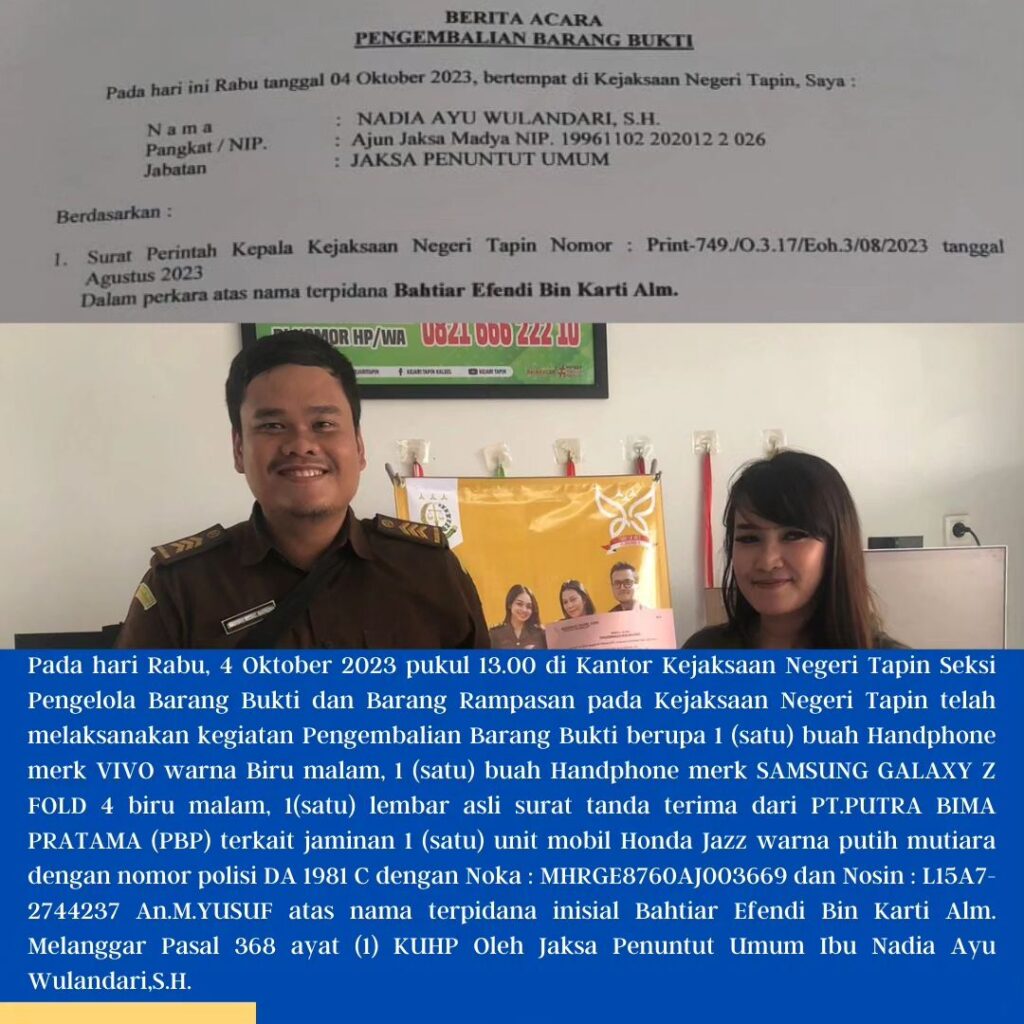 Pada hari Rabu, 4 Oktober 2023 pukul 13.00 di Kantor Kejaksaan Negeri Tapin Seksi Pengelola Barang Bukti dan Barang Rampasan pada Kejaksaan Negeri Tapin telah melaksanakan kegiatan Pengembalian Barang Bukti berupa 1 (satu) buah Handphone merk VIVO warna Biru malam, 1 (satu) buah Handphone merk SAMSUNG GALAXY Z FOLD 4 biru malam, 1(satu) lembar asli surat tanda terima dari PT.PUTRA BIMA PRATAMA (PBP) terkait jaminan 1 (satu) unit mobil Honda Jazz warna putih mutiara dengan nomor polisi DA 1981 C dengan Noka : MHRGE8760AJ003669 dan Nosin : L15A7-2744237 An.M.YUSUF atas nama terpidana inisial Bahtiar Efendi Bin Karti Alm. Melanggar Pasal 368 ayat (1) KUHP Oleh Jaksa Penuntut Umum Ibu Nadia Ayu Wulandari, S.H.