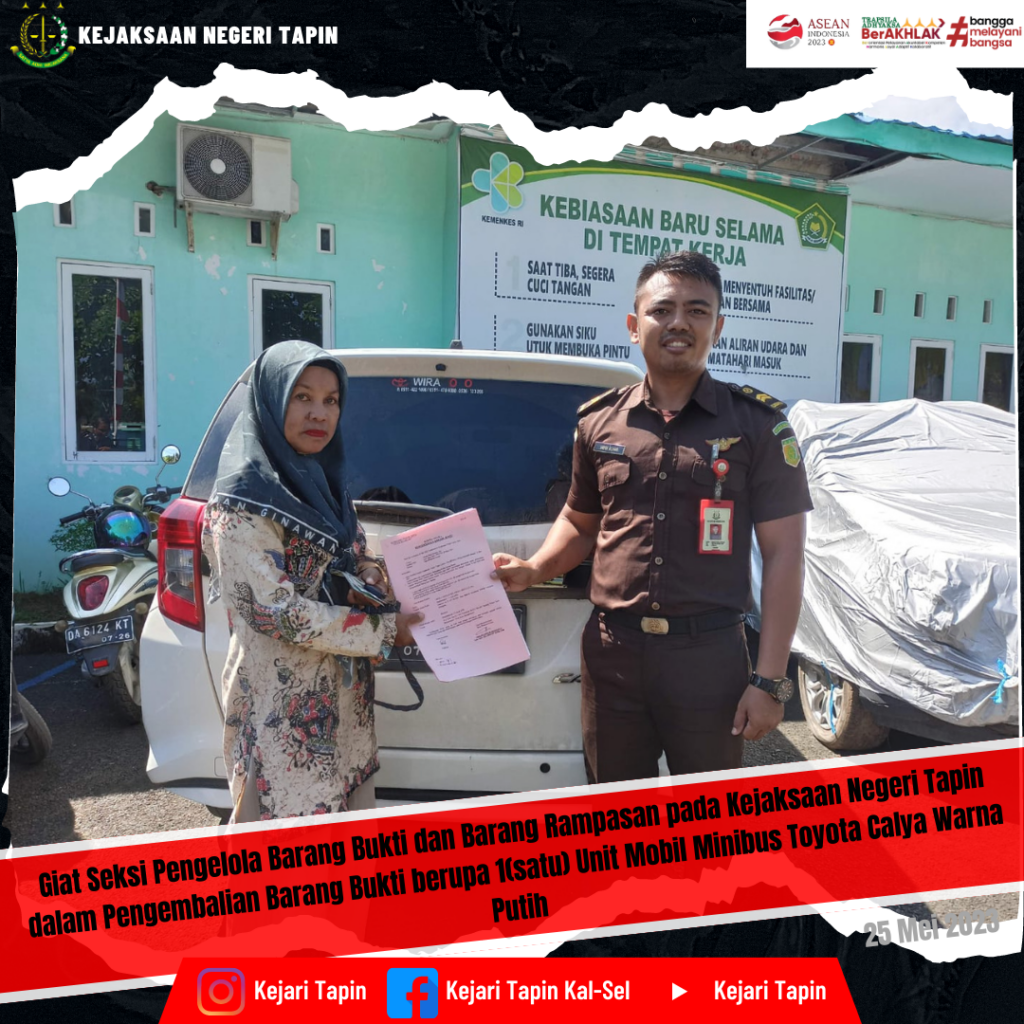 Telah Melaksanakan Pengembalian Barang Bukti berupa 1 (satu) unit Mobil minibus Toyota Calya DA 1201 JR warna putih dengan Noka MHKA6GJ6JNJ153515 serta Nosin 3NRH691297 dan 1 (satu) lembar STNK Mobil minibus Toyota Calya DA 1201 JR warna putih dengan Noka MHKA6GJ6JNJ153515 serta Nosin 3NRH691297