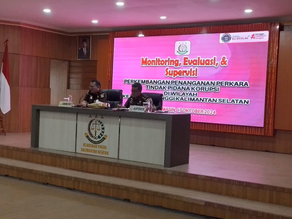 Pada hari Kamis tanggal 17 Oktober 2024 bertempat di Kejaksaan Tinggi telah dilaksanakan kegiatan Monitoring, Evaluasi dan Supervisi Terkait Penanganan Perkara Tindak Pidana Korupsi dari Tim Monev Wilayah IV pada Jaksa Agung Muda Tindak Pidana Khusus. Kegiatan tersebut dihadiri oleh Kepala Kejaksaan Negeri Tapin Bapak Arya Wicaksana, S.H., M.H.