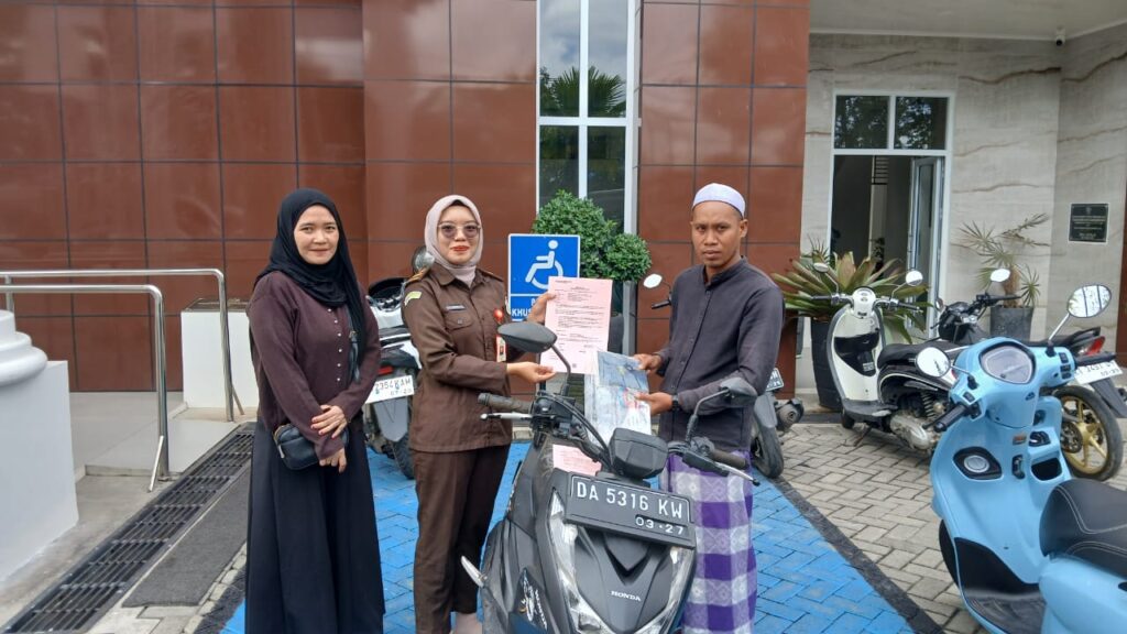Pada hari Senin 07 Juli 2025 pukul 15.00 di kantor Kejaksaan Negeri Tapin, Seksi Pemulihan Aset dan Pengelolaan Barang Bukti telah melaksanakan kegiatan Pengembalian Barang Bukti berupa 1 (satu) Unit sepeda motor Merk Honda Beat Street warna hitam dengan nomor Polisi DA 5316 KW dengan Nosin: JM82E1393970 dan Noka: MH1JM8212MK395851 Type: H1B02N41L0 AT Tahun 2021, 1 (satu) lembar STNK Merk Honda Beat Street warna hitam dengan nomor Polisi DA 5316 KW dengan Nosin: JM82E1393970 dan Noka: MH1JM8212MK395851 Type: H1B02N41L0 AT Tahun 2021, 1 (satu) buah BPKB Merk Honda Beat Street warna hitam dengan nomor Polisi DA 5316 KW dengan Nosin: JM82E1393970 dan Noka: MH1JM8212MK395851 Type: H1B02N41L0 AT Tahun 2021