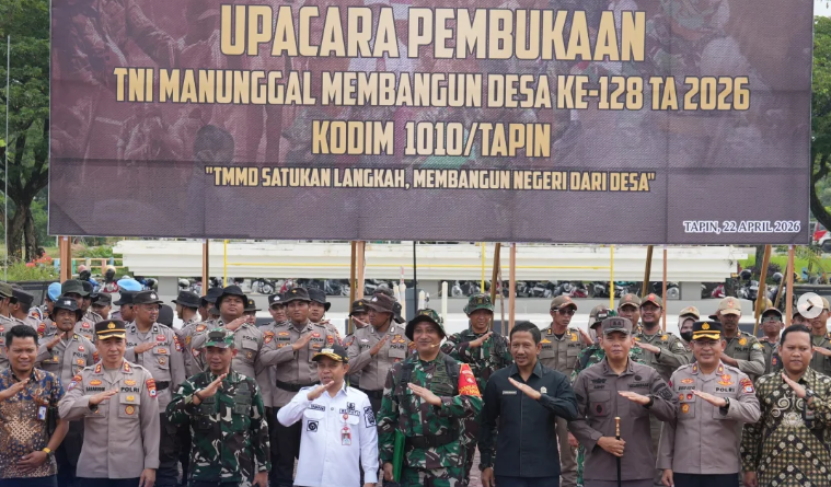 Pada hari ini, Rabu, tanggal 22 April 2026, Upacara Pembukaan TNI Manunggal Membangun Desa (TMMD) Ke-128 Tahun Anggaran 2026 dengan tema “TMMD Satukan Langkah, Membangun Negeri Dari Desa” dilaksanakan secara khidmat di Lapangan Kecamatan Tapin Utara, Kabupaten Tapin. Kegiatan ini berlangsung dengan penuh semangat kebersamaan dan dihadiri oleh unsur Forum Koordinasi Pimpinan Daerah (Forkopimda), jajaran pemerintah daerah, tokoh masyarakat, serta berbagai elemen masyarakat yang turut mendukung suksesnya pelaksanaan program TMMD.